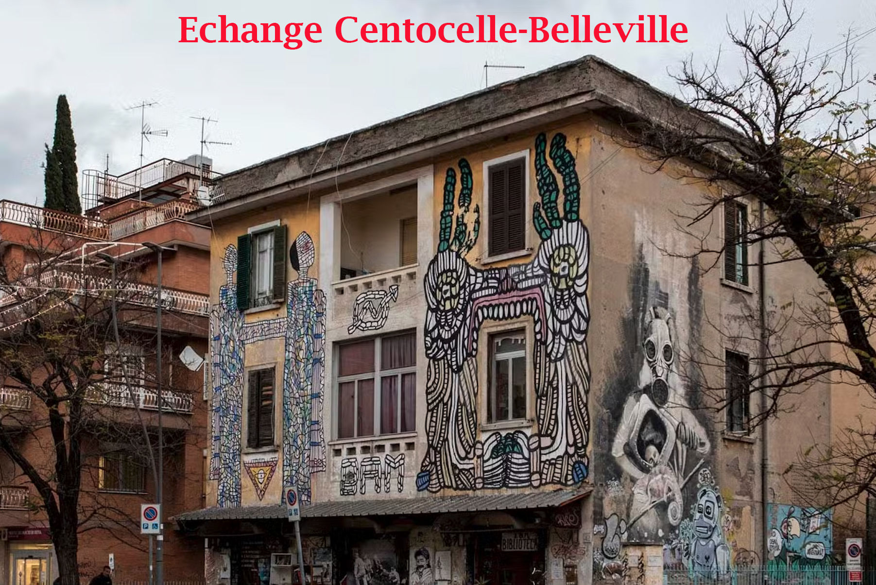 Échange avec des artistes du quartier de Centocelle et Pigneto à Rome (Italie), quartiers populaires de l’Est de Rome aux origines multiples et doté d’une histoire riche et contemporaine, un espace qui partage avec Belleville beaucoup de particularités, ainsi qu’un tissu associatif alternatif et dynamique.